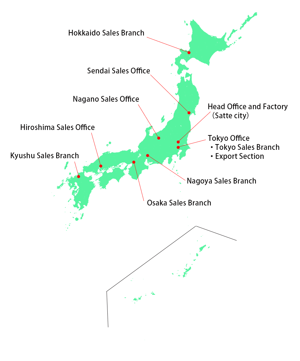 Iwamoto-cho 1-8-15, Chiyoda-ku,Tokyo 101-0032, Japan TEL : +81-3-5820-3088 FAX : +81-3-5823-7594 ※ Please contact here for overseas business. Oaza-kamiyoshiba 2100-33, Satte city, Saitama 340-0121, Japan TEL : +81-480-48-0891 (Representative) FAX : +81-480-48-0137